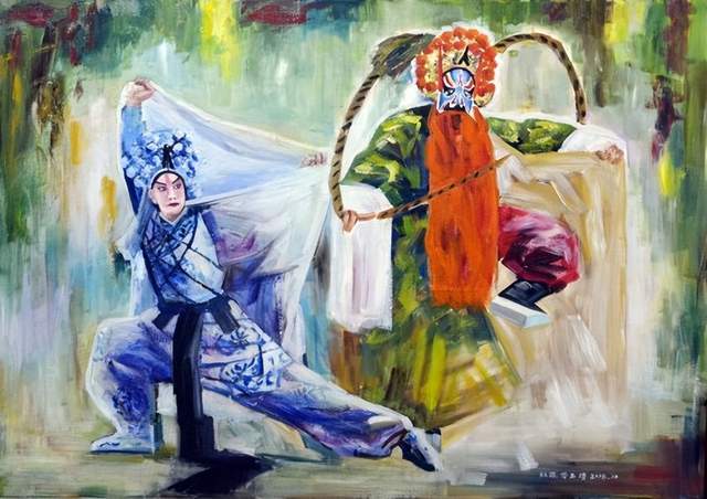 画面左边略偏下方的黄天霸也非等闲之辈,采用“雕塑美”的手法:他开腿“弓箭步”右腿弓左腿伸,右臂过头、翻腕,左臂平伸略上抬“翻腕”双手拉起战袍下摆面略向左傲视对方,面部和胸脯呈相反方向一个叱咤风云的江湖豪杰亮出了“雕塑之美”,加之油画明暗透视色性等科学方法,运用光线、色彩、笔触特别是色彩的丰富窦尔敦这个大花脸残缺美更是有用武之地,呈现出了东方之美的油画京剧人物的作品。