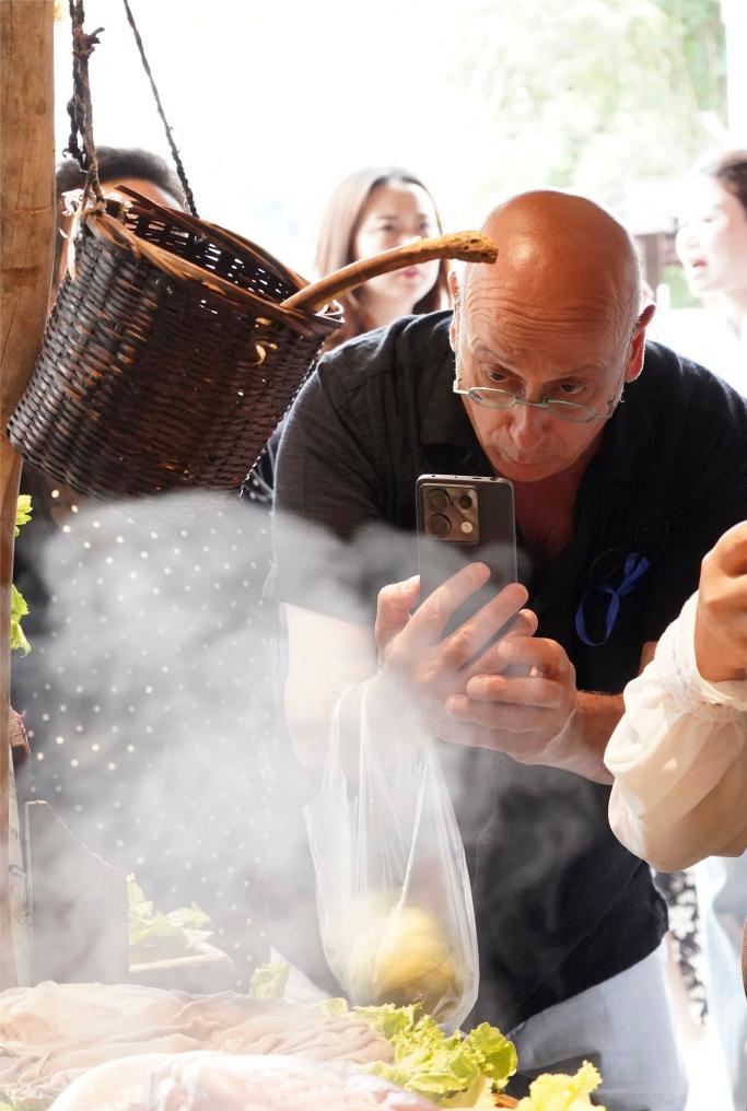 外国游客在四川旅游途中拍摄美食(6月7日摄)。新华社记者 张超群 摄